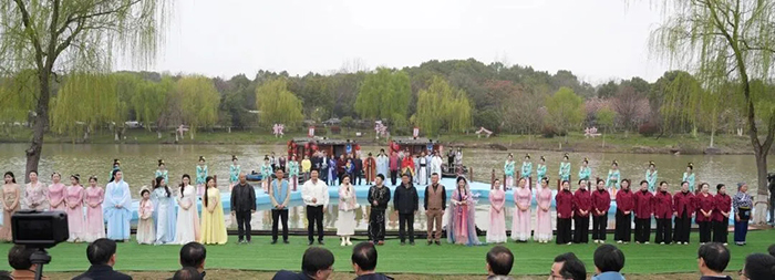 最后一艘画舫载着来自全国各地的诗人代表徐徐驶来。广东诗人邱尾菊、贵州诗人龙书丞、山东诗人王维霞、安徽诗人方启华与池州本土诗人王韩炉共同朗诵《大地流彩 盛世春光》,“我们借诗经的平仄、唐风的格调、宋雨的韵律,和着新时代的节拍,唱响盛世辉煌——”诗人们用最质朴的文字书写乡村振兴的时代新篇。