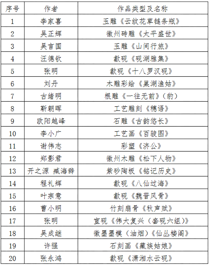 “徽雕天下 艺刻天工”——首届安徽省雕刻工艺精品展暨长三角精品邀请展及其系列活动,10月15日如期在广德市举办。根据活动方案要求,展览期间,推出20件优秀作品。经省文联机关纪委监督指导,评委认真严格评选,最终推出20件优秀作品,现予以公示: