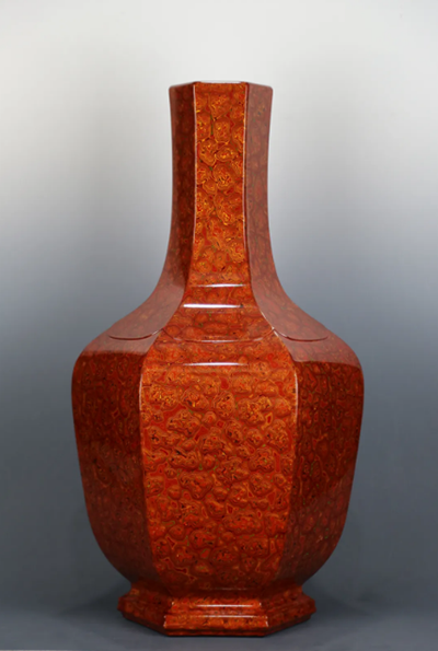 品名:红金斑犀皮漆六方瓶