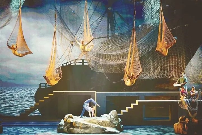 《深蓝的回声》中展示了约25项杂技的大项目,体现出演出单位丰富的演员和技术储备。剧首借助创新的“皮条”技巧模拟咬钩的“大黄鱼”,剧中小演员表演一群斑海豹“偷鱼”的桥段萌趣而不简单,剧尾则以高难度的“蹦床”形式表现网箱中翻腾的“大黄鱼”,逻辑清晰,首尾呼应,形成“发愿—悖愿—如愿”的故事闭环。演员的“腾空飞杠”“浪桥”技巧,更是惊心动魄地再现了渔民与海上风暴的搏斗,凸显了人性的张力和生命的伟力。