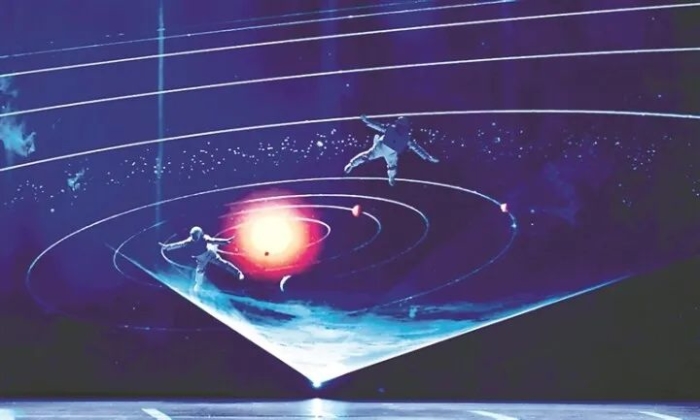 《逐梦太空》刻画航空兵部队精英的飒爽群像,全剧节奏明快、情节丰富,呈现一种加速美学的质感,体现出杂技的灵活形态与当下快节奏生活的双向奔赴。通过舞台调度逻辑和科技手段创新空间的结构方法,加上天马行空般的科学幻想,建构起舞台新的时间秩序与视觉逻辑。快速的幕间转换形成一种流动感,营造“视觉连续性”的沉浸式体验。幻化出的“模拟空天城”和充满浪漫色彩的太空,是杂技人想象力、创造力以及精神的外化。