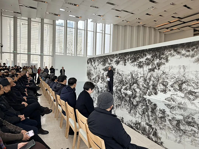 开幕式上,泾县文旅投集团负责人介绍了宣纸小镇的总体情况;策展人高世强介绍了本次展览的设计理念和策展思路;许江对展览的举办表示欢迎与祝贺,充分肯定了袁柳军的艺术探索精神,并对山水画意境融入建筑空间、赋予场所艺术生命的创作理念给予高度评价;袁柳军分享了自己的创作感悟。