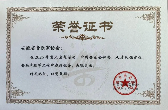会上,安徽省音协因在2025年重大主题活动、中国音乐金钟奖、人才队伍建设、音乐考级等工作中成绩优异,表现突出,受到中国音协表彰。