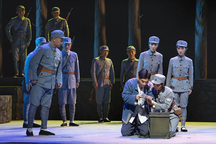 李安本形象塑造格外引人关注之处,在于注重对其心理轨迹细腻精致的描摹刻画,层次分明,步步推进,颇具悬念感。这是对原著的精到提炼与深度建设,也是同类题材中人物塑造的别出心裁。李安本的转变经历了从懵懂到成熟,被动到主动,参与者到革命者的过程。从被迫上山,到主动留下,从苟且活着,到活出人样,从怕死逃跑,到无畏生死,向死而生,其内心世界在人物演唱和动作中被勾描得曲折有致,真实可感。这其中他由害怕革命到了解革命,认同革命到协助革命并投身革命的进阶式变化,来自于受到新四军官兵为了人民勇于牺牲精神的强烈冲击。为了救出他的老娘,大鹏舍命下山,为了让他活着,新四军战士以人肉做钢板,为他挡住子弹,为了让他回家孝敬老娘,留过洋的大学生战士主动做其学生,学成后放其下山。他从最初的歪点子一个接一个、到为新四军主动寻找信号、组建通信班,最后由衷自问自答:“为什么大鹏拼死下山去,为什么杨老四执意要当新四军,为什么他们为我挡子弹,为什么他们甘愿牺牲把重担扛……为了泱泱中华不再受劫难,为了天下百姓不再遭祸殃。为了中国人活出个人模样,为了中国人从此可以挺脊梁”。李安本在太阳山上见到了许多新四军官兵生命的转瞬即逝,英雄的精神和热血照亮了他的灵魂深处,由此他下决心跟定新四军、共产党。一个原本有着灰色调性的普通人,被新四军所感动,在新四军这个大家庭里感受到国家命运与自身命运的息息相关,对英雄的崇敬、对日寇的憎恨,以及知恩图报的中国伦理使之彻底觉醒,完成精神蜕变,一个崭新的人物在舞台上立起来。剧中传递的爱国抗日的不屈意志,产生震撼性效果,与观众的审美期待相贴近。