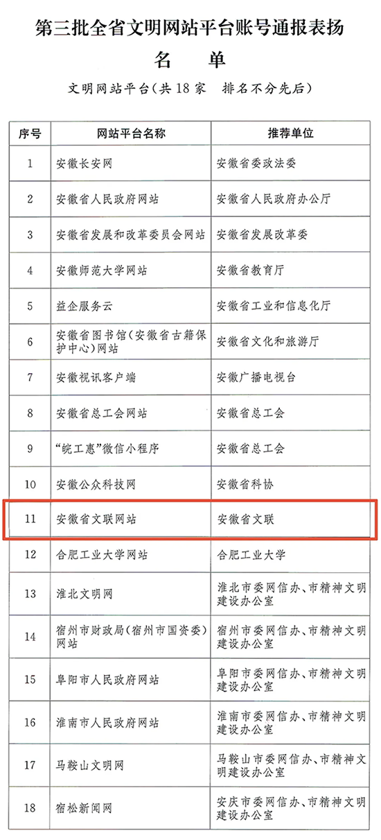 2025年12月25日,省委网信办、省文明办印发《关于表扬第三批全省文明网站平台账号的通报》,决定对18家文明网站平台,40个文明账号予以通报表扬。其中,安徽省文联官方网站获评第三批全省文明网站平台。
