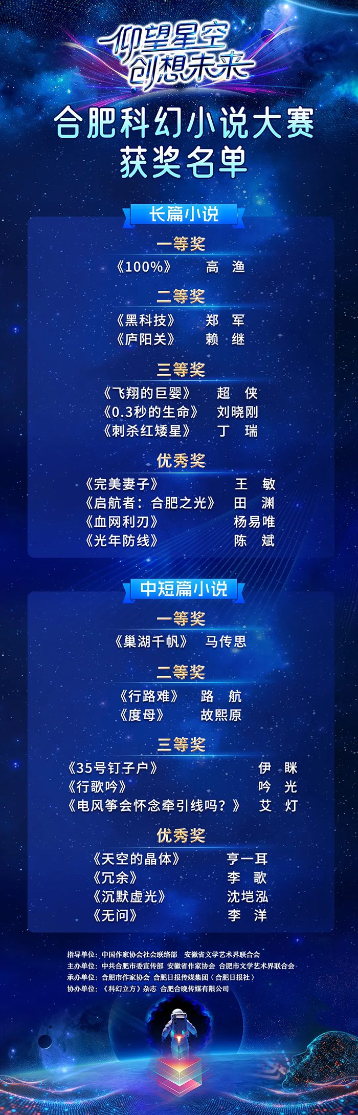 其中,长篇小说一等奖桂冠被刘凉军(高渔)的《100%》摘得,郑军《黑科技》和赖继《庐阳关》获二等奖,超侠《飞翔的巨婴》、刘晓刚《0.3秒的生命》、丁瑞《刺杀红矮星》获三等奖,王敏《完美妻子》、田渊《启航者:合肥之光》、杨易唯《血网利刃》、陈斌《光年防线》获优秀奖;中短篇小说一等奖花落马传思的《巢湖千帆》,路航《行路难》和故熙原的《度母》获二等奖,伊眯《35号钉子户》、吟光《行歌吟》、艾灯《电风筝会怀念牵引线吗?》获三等奖,亨一耳《天空的晶体》、李歌《冗余》、沈垲泓《沉默虚光》、李洋《无问》获优秀奖。这些作品不仅构思精巧、文笔精湛,更在思想深度与艺术表达上实现了双重突破。
