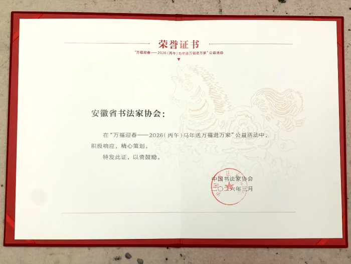 会议表彰了2025年度优秀理事,2026年“万福迎春”公益活动优秀团体会员、先进集体和先进个人。安徽省书协荣获优秀团体会员称号,合肥市、安庆市、宣城市、阜阳市、黄山市五市书协获评先进集体,张晓曦、罗传厚、伊力三位同志荣获先进个人称号。